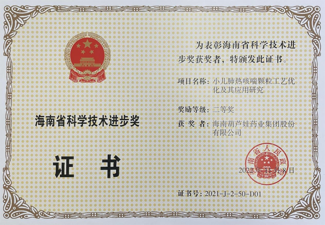 为此,小儿肺热咳喘颗粒的制备方法获得了第二十一届中国专利优秀奖(2019年),专利申请号:ZL201010134951,此次作为专利技术的应用,获得了2021年度海南省科学技术进步奖二等奖。在此之前,宝博牌小儿肺热咳喘颗粒还多次被授予“临床价值中成药品牌”、“中国连锁药店最具合作价值单品”,荣登“中国医药品牌榜”。