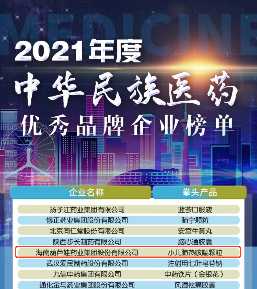 12月29日,全国工商联医药业商会发布了“2021年度中华民族医药优秀品牌企业榜单”,宝博药业集团凭借黄金单品小儿肺热咳喘颗粒(4克)实力登榜。